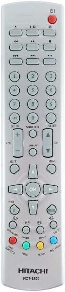 Helyettesítő távirányító HITACHI RCT-1522 (RCT1522) - 100%-os 1:1 arányú helyettesítője az eredeti távirányítónak. A távirányító a HITACHI:AKAI AKTV195, DLC-E2450, GRUNDIG 845D47JP3XBGRH, HIT15L387, HIT15WDVB, HIT19L387, HIT19L387E, HIT19LI387E, HIT19WDVB, HIT22L387, LED AKTV225, LED AKTV245, LED DLC-D1805L. (Előfordulhat, hogy nem minden kompatibilis modell szerepel a listában