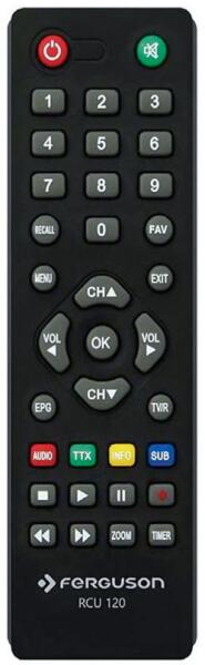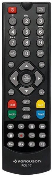 Helyettesítő távirányító FERGUSON ARIVA T265 DVB-T2, RCU 101 (ARIVA T265 DVBT2, RCU 101) - 100%-os 1:1 arányú helyettesítője az eredeti távirányítónak. A távirányító a FERGUSON:ARIVA T265 DVB-T2, ARIVA-T265-DVB-T2, ARIVAT265DVBT2, RCU 101, RCU101, T760 DVB-T2, T760-DVB-T2, T760DVBT2, T760I. (Előfordulhat, hogy nem minden kompatibilis modell szerepel a listában. Ha nem biztos be