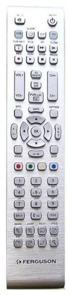 Helyettesítő távirányító FERGUSON ARIVA TT HD PVR - 100%-os 1:1 arányú helyettesítője az eredeti távirányítónak. A távirányító a FERGUSON:ARIVA TT HD PVR. (Előfordulhat, hogy nem minden kompatibilis modell szerepel a listában. Ha nem biztos benne, csak adja meg a készülékmodelljét (online chat-en vagy e-mailben), és mi azonnal ellenőrizzük, if kompatibilis-e az Ön kész