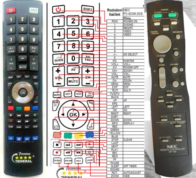 Helyettesítő távirányító NEC RP109 - 100%-os 1:1 arányú helyettesítője az eredeti távirányítónak. A távirányító a NEC:42VP4DG, PX-42VP4G, PX-42XM2G, PX-50XM3G. (Előfordulhat, hogy nem minden kompatibilis modell szerepel a listában. Ha nem biztos benne, csak adja meg a készülékmodelljét (online chat-en vagy e-mailben), és mi azonnal ellenőrizzük, if kompatibilis-e az Ön