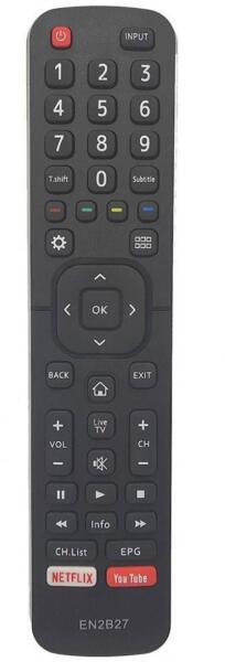 Vadonatúj helyettesítő távirányító HISENSE EN2B27. A távirányító a HISENSE:32K3110W, 32N4, 39N4, 40K3110PW, 40K321UW, 40K321UWT, 40K3300UW, 43B6000PW, 43K3110PW, 43N6, 49K3110PW, 50K3110PW, 50K321UW, 50K321UWT, 50K3300UW, 50M7000UW, 50M7000UWG, 50N4, 50N6, 55K3110PW, 55K321UW, 55K321UWT, 55K3300UW, 55K720UW, 55K720UWG, 55M7000UW, 55M7000UWG, 55N4, 55N5, 55N6, 58K321UW, 58K321UWT, 58K322