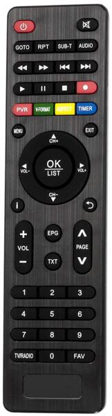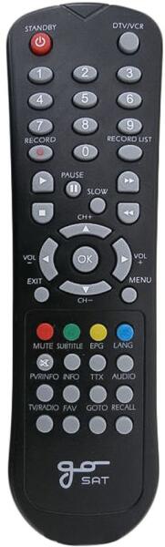 Helyettesítő távirányító GOSAT GS9010PVR - 100%-os 1:1 arányú helyettesítője az eredeti távirányítónak. A távirányító a GOSAT:GS-9010PVR, GS9010PVR. (Előfordulhat, hogy nem minden kompatibilis modell szerepel a listában. Ha nem biztos benne, csak adja meg a készülékmodelljét (online chat-en vagy e-mailben), és mi azonnal ellenőrizzük, if kompatibilis-e az Ön készülék
