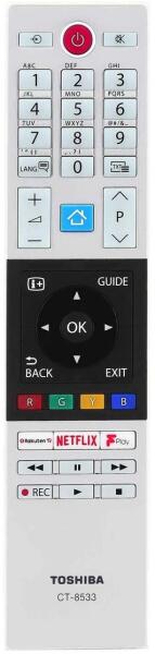 Vadonatúj eredeti távirányító TOSHIBA CT-8533 (CT8533). A távirányító a TOSHIBA:24D2863DB, 24D3863DB, 24L2863DB, 24W2863DB, 24W3863DB, 28W2863DB, 28W3863DB, 32D2863DB, 32D3862DB, 32D3863DB, 32L2863DB, 32L3863DB, 32L3963DG, 32W2863DB, 32W3863DB, 40L2863DB, 43L2863DB, 43L3863DB, 43U6863DB, 43V6863DB, 48L2863DB, 49L2863DB, 49L3863DB, 49U6863DB, 49V6863DB, 55U6863DB, 55V6863DB, 65U6863DB, 65V