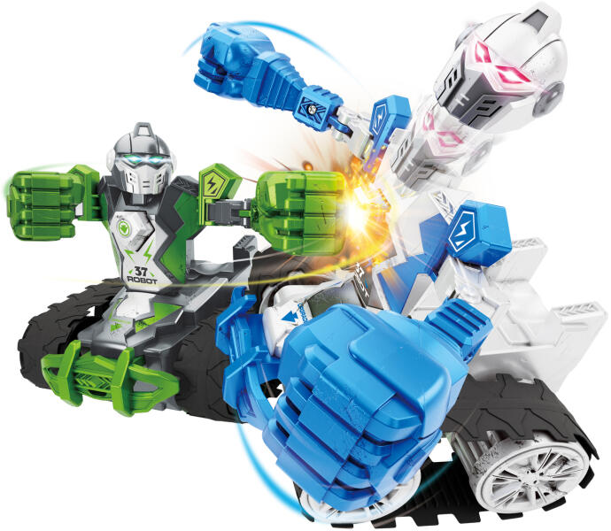 Robot 22,5 cm-es box játék készlet 2 db. A robot méretei 22,5 x 14 x 14 cm. A csomag 2 db robotot tartalmaz távirányítóhoz, töltő USB kábelt. Játék két játékos számára. A robot kilövi a fejét, amikor megüti a mellkason lévő kapcsolót. 2,4 GHz-es frekvencia.