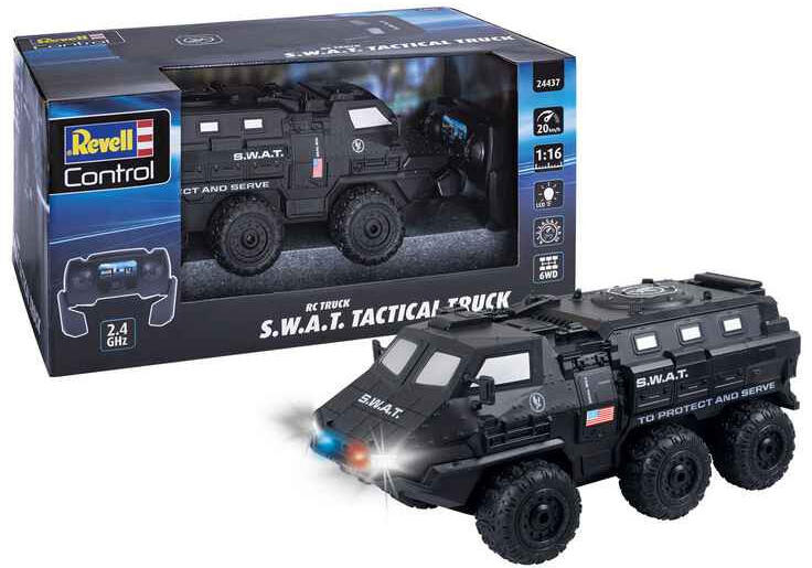 Élj át izgalmas kalandokat és tiszta vezetési élményt a Revell Control S. W. A. T. Tactical Truck RC Truck-kal. Ez a rendkívül részletes és valósághűen megtervezett jármű megdobogtatja a kicsik és nagyok szívét. A teherautó tökéletes a 8 éves és idősebb gyerekek számára, akik izgalmas RC élményekre vágynak - akár beltéren, akár kültéren. Élj át izgalmas kalandok
