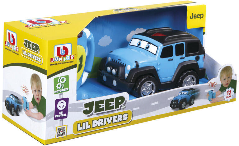 Bburago Jr. távirányítós Jeep Wrangler Jeep ""Lil Drivers"": Távirányítós Jeep Wrangler Unlimited, incl. infravörös távirányító, 12 hónapos kortól ajánlott. Autó akkumulátorok: 2x AAA nem tartozék Távvezérlő elem: 3x AAA nem tartozék A BB Junior „Jeep Lil Driver Jeep Wrangler R/C játékautó szuper szabadtéri akciókat garantál a fiatal vezetők számára. A távirány