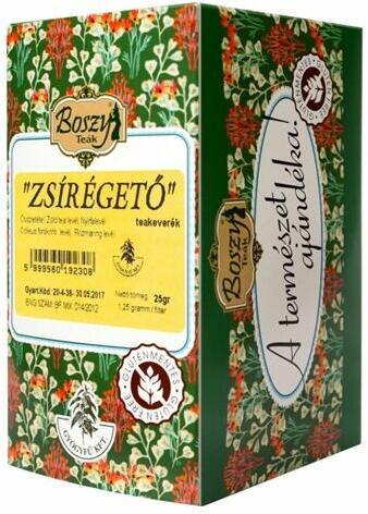 ZSÍRÉGETŐ filteres teakeverék 20 filter Gyógyfű Előnyösen befolyásolja a zsíranyagcserét, hatóanyagai meggyorsíthatják a fogyást . Tisztít , méregtelenít , a zöld tea a kedélyállapotot is javítja. Megfelelő étrend betartása mellett segíti a szervezetet a fogyókúrában. Mit tudhatunk a benne található növényekről? A zöld tea közismerten gazdag élettanilag érték