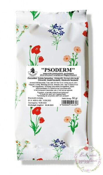 PSODERM gyógytea keverék pikkelysömör (psoriasis), gyulladásos bőrelváltozások (dermatitis) terápiájának kiegészítéséhez. Speciális hatással rendelkező gyógytea keverék Subás farkasfog (Bidens tripartita)A tea vezető komponense . Az orosz hivatalos és népgyógyászatban egyaránt sokra értékelik. Az Orosz Gyógyszerkönyvben hivatalosan elismert. Sokoldalú gyógynövény