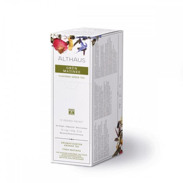 A keverék sencha zöld teát, napraforgót, kukoricavirág-és rózsaszirmokat, valamint aromákat tartalmaz. Íze enyhe és selymes, utóíze pedig hosszan lecseng a szájban. Kiszerelés: 15 x 4 g = 60g Althaus Grün Matinee filteres tea 15*4g Ez a tea a sencha, az ízletes gyümölcsaromák és a virágszirmok egyedi kombinációja. Íze kellemes, illata finom, virágaromákban gazdag, főzete
