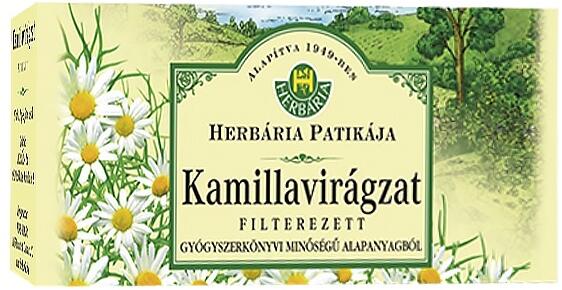 Herbária kamillavirágzat tea 25x1g Hivatalos magyarországi forgalmazótól. Leírás: Emésztőrendszeri panaszok esetén, enyhe gyomor- és bélgörcsök, valamint felfúvódás kezelésére használható. Külsőleg bőr- és nyálkahártya-, valamint íny- és szájüregi gyulladások kezelésére öblögetőszerként, légúti panaszok esetén inhalálásra alkalmazható. Használati javasl