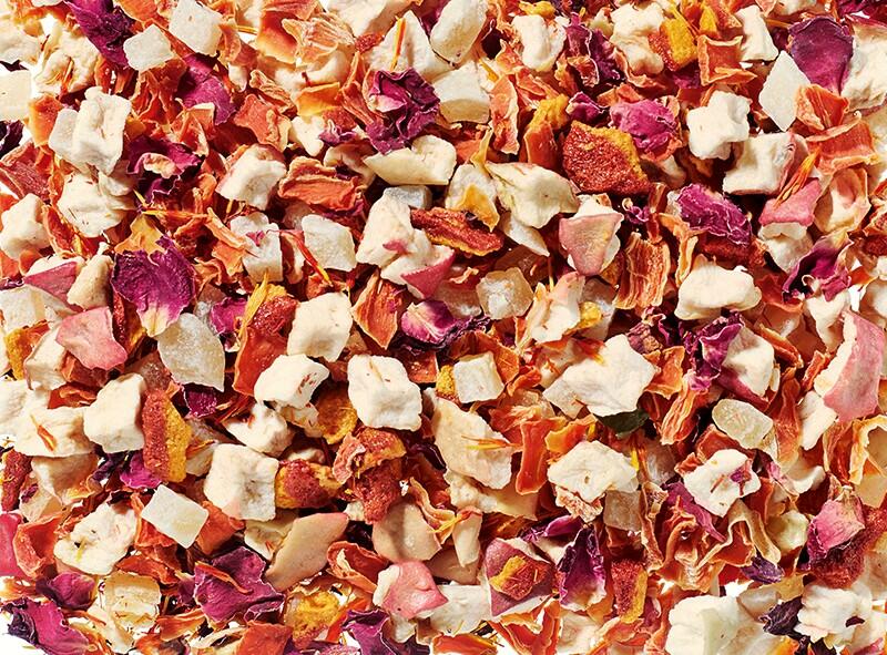 RAKTÁRRÓL AZONNAL! Összetétel: almakocka, sárgarépapehely, ananászkocka, fagyasztott-szárított őszibarack, sárgabarack, mandarin, sárgarépa, természetes ízesítő, rózsavirág, sáfrány ELKÉSZÍTÉSI JAVASLAT 2,5 dl forró vízhez egy-két teáskanál teafüvet adjunk ízlés szerint. Kannában való forrázás esetén plusz egy teáskanállal, majd 5-8 perc után szűrjük le. A