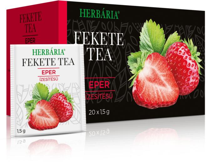 Összetevők: fekete tea (89 %), eper aroma (10 %), eper pehely (1 %). Származási hely: Magyarország