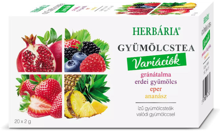 Herbária Tea Variációk Gránátalma-Eper 20 filter Gyümölcstea variációk valódi gyümölccsel, gránátalma, erdei gyümölcs, eper, ananász ízű. Elkészítési javaslat: A csészébe helyezett 1 db filter tasakot 1,5 dl vízzel leforrázzuk, 1-3 percig állni hagyjuk. Tetszés szerint ízesítve fogyasztható. Tárolás: Száraz, tiszta, hűvös helyen tartandó. Összetevők: Gránát