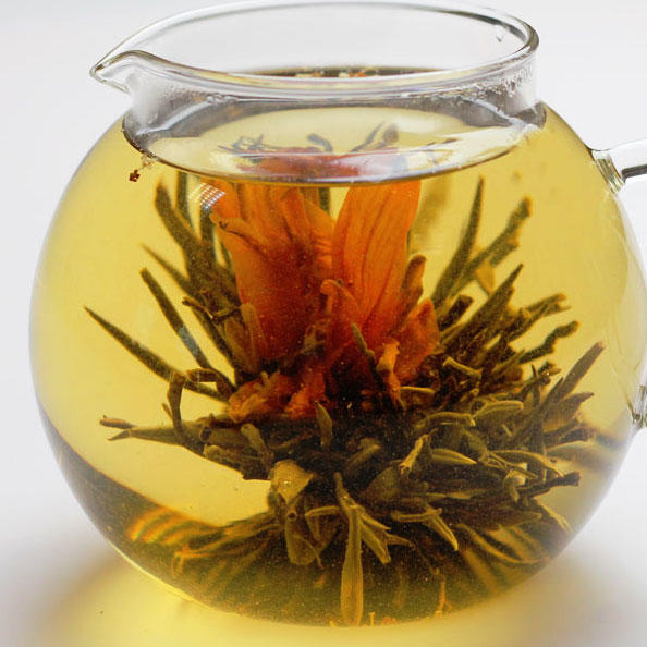 Kizárólag a császári asztalra tartozott. Később, mintha elveszett volna, de újból fel lettek fedezve és attól kezdve a kínálatunkban is megtalálható. Az úgynevezett virágzó teák Kínához tartoznak, mint a porcelán és a papír. Az egyedi szépségük viszont a belsejükben rejtőzik. Forró vízzel való leöntés után a zöld kavics kinyílik és a belsejében lévő színes