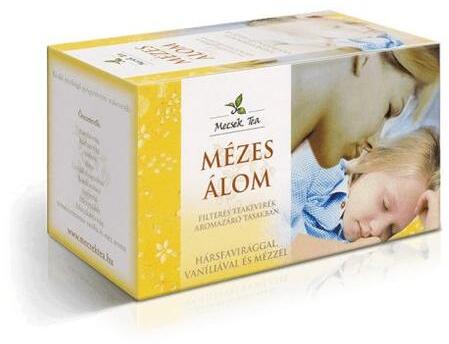 Mézes álom filteres tea A Mézes álom tea rendkívül finom, önmagában már édeskés ízét a feszültségoldó gyógynövények mellett a benne megtalálható rooibosnak és vaníliának köszönheti. A teakeverék természetes és kíméletes módon segíthet leküzdeni a nyugtalanságot és az álmatlanságot. A tea fogyasztását 6 éves kortól ajánljuk! Elkészítési javaslat: A teaf