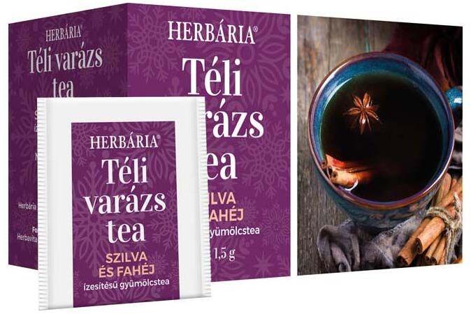 Jellemzők A Herbária Téli varázs szilva és fahéj ízesítésű élvezeti gyümölcsteája meghitt pillanatokat varázsol. Fekete teát nem tartalmaz. Összetevők Alma, hibiszkuszvirág, csipkebogyóhús, fahéj (4,8%), szilva és fahéj aroma (4,8%). Elkészítési javaslat 1 filter tasakot kb. 2 dl forró vízzel leöntünk, majd 5-6 perc áztatás után ízesítve vagy ízesítés nélkü