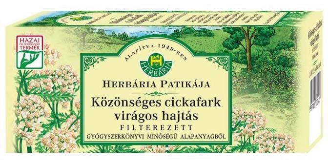 Közönséges cickafark filteres tea. Termékismertető: Alkalmazható étvágytalanság, emésztési zavarok, hastáji görcsök esetén. Külsőleg a bőr és a nyálkahártya gyulladásainak enyhítésére, kisebb sebek kezelésére, valamint alhasi görcsök esetén ülőfürdőként. Alkalmazási javaslat: A csészébe helyezett 1 db filter tasakot / 2 teáskanál vágott drogot leforrázzuk