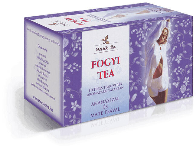 MECSEK Fogyi tea ananásszal és mate teával filteres Serkentheti az anyagcserét, csökkentheti az éhségérzetet. C-vitamin tartalma révén erősítheti a szervezetet. Kiszerelés: 20 x 1g aromazáró tasakban Leírás: Ananásszal és Maté teával. Felhasználási javaslat: 1 teafiltert öntsünk le 1,5-2 dl forró vízzel, majd hagyjuk állni 5-10 percig. A fenti mennyiséget legfeljebb 2-