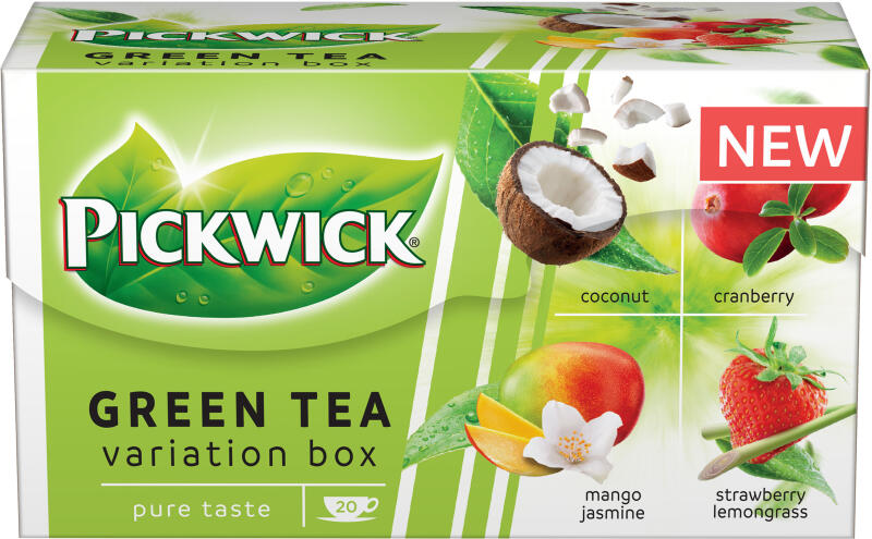 Pickwick Green Tea Variation 20x 1,5g Áfonyával ízesített zöld tea. Kókuszos ízű zöld tea. Eperrel és citromfűvel ízesített zöld tea. Jázminnal és mangóval ízesített zöld tea. Hozzávalók: Áfonyával ízesített zöld tea: Zöld tea, aroma. Áfonyadarabok (0,8%). Kókuszos ízű zöld tea: Zöld tea, természetes aroma. Kókuszreszelék (2%). Eperrel és citromfűvel ízesít