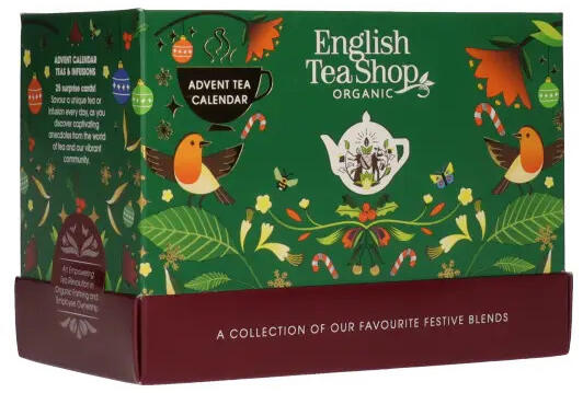 ETS 25 Exclusive Adventi bio teakalendárium - zöld -új -25 db papírfilteres teafilter -13 féle íz. Az English Tea Shop exclusive adventi teakalendáriuma, melynek mindenki örül. Csodálatos 25 db egyenként csomagolt számozott teafilter, az adventi időszakra. 2x Fehér tea kókusz & maracuja bio tea - Összetevők: fehér tea* (51%), citromfű*(16.5%), kakaó* (9%), pörkölt kókusz