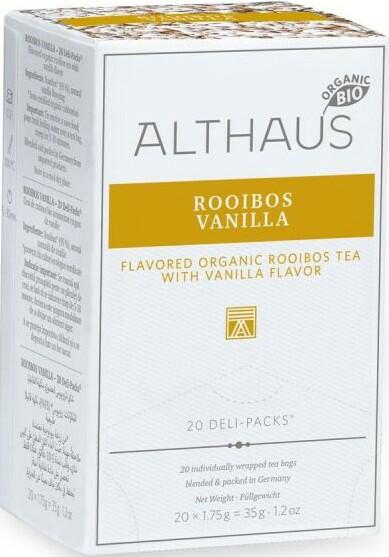 Tea Althaus BIO Rooibos Vanília 35g A zamatos vanília illata a bio rooibos földes édes ízét hozza magával. A természetesen koffeinmentes tea remek társ egész nap. Az EU-ban készült.