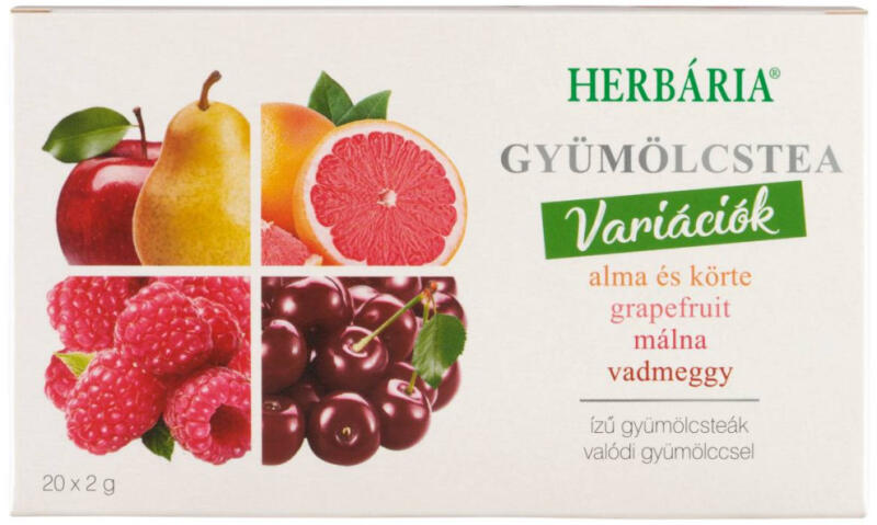 Herbária Tea Variációk Alma-Körte 20 filter Alma-körte, grapefruit, málna, vadmeggy ízű gyümölcsteák. Fekete teát nem tartalmaz! Használati útmutató Elkészítési javaslat: 1 filter tasakot kb. 2 dl forró vízzel leöntünk, 5-6 perc áztatás után tetszés szerint ízesítve fogyasztható. Tárolás Minőségét megőrzi (nap/hónap/év): a dobozon jelzett időpontig száraz, ti