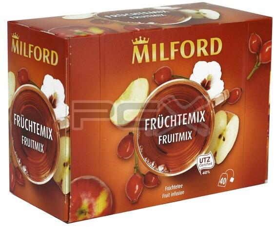 MILFORD VEGYESGYÜMÖLCS ÍZŰ FILTERES TEAKEVERÉK 40DBA gyümölcsteák egész évben ideális választás. Télen forrón, frissen elkészítve kiváló ízélményt nyújtanak, míg a nyári hónapokban jéggel hűtve igazi felfrissülés!Összetevők:, Hibiszkusz (45 %), csipkebogyó (33%), narancshéj, alma (9%), bodza, citromhéj. Tápérték 100ml termékben:, Energia 18kJ / 2kCal, Fehérj