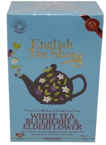 Ellenőrzött ökológiai gazdálkodásból származó összetevőkkel, áfonya és a bodza frissítő ízével. 20x1,5 g-os bio fehér tea; English Tea Shop termék a bio teák kedvelőinek.