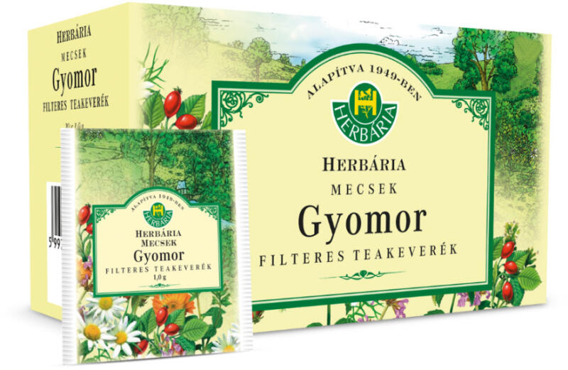 Gyomorbántalmak esetén, gyomor-és nyombélfekély megelőzésére Herbária Mecsek Gyomor filteres teakeverék Összetevők: körömvirág (Calendulae flos), kamillavirágzat (Matricariae flos), közönséges cickafark virágos hajtás (Millefolii herba), csipkerózsa áltermés (Rosae pseudo-fructus), keserű édeskömény termés (Foeniculi amari fructus), közönséges orbáncfű virágos ha