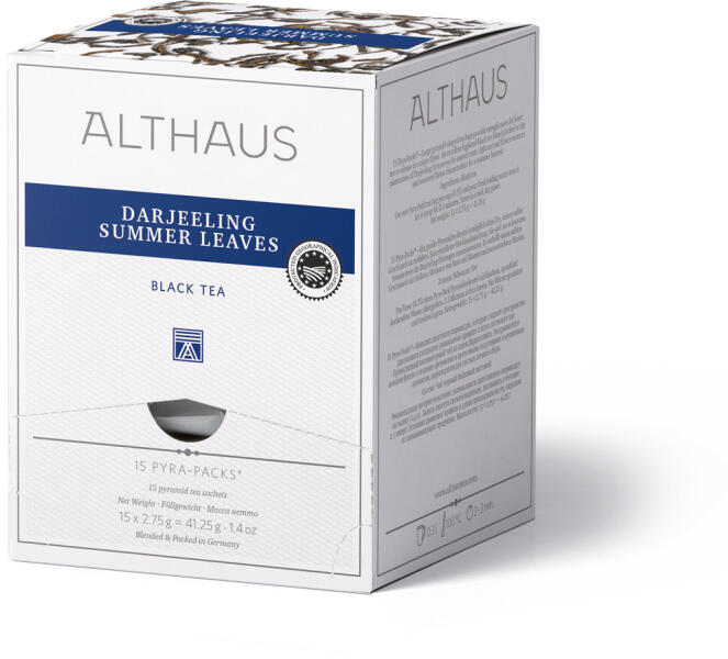 Althaus fekete tea - Darjeeling Summer Leaves 15x2,75g Korábban Darjeeling Castelton. Új név, ugyanaz a tea! Hozzávalók: Tiszta fekete tea. India származása Ez a kiváló tea a Himalája híres Darjeeling ültetvényéről származik. Enyhe ízű, enyhén diós árnyalattal. Németországban készült.