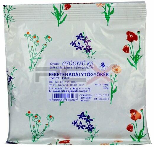 Borogatásként zúzódások, nehezen gyógyuló, fekélyes sebek kezelésére ajánlott. Igazolt hatása az új sejtek növekedésének segítése és a gyulladások csökkentése. Használata napjainkban csak külsőleg ajánlott! Összetevők: fekete nadálytőgyökérA teakészítés ajánlati módjai:Virágokból, levelekből, füvekből álló teák esetén 1 csésze teához (2,5dl) egy csap