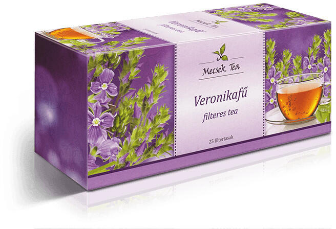MECSEK Veronikafű tea 25 filteres A veronikafű teája hörghurut és nehézlégzés esetén köptető hatású. Emellett hatásos köszvény és reuma kiegészítő kezelésében. Kiszerelés: 25 x 1 g Leírás: Használják köptető hatása miatt, de hasmenéssel járó bélhurutban is. Nőknél a változás korában, klimax esetén is fellépő panaszok enyhítésére ajánlják. A tea tartó