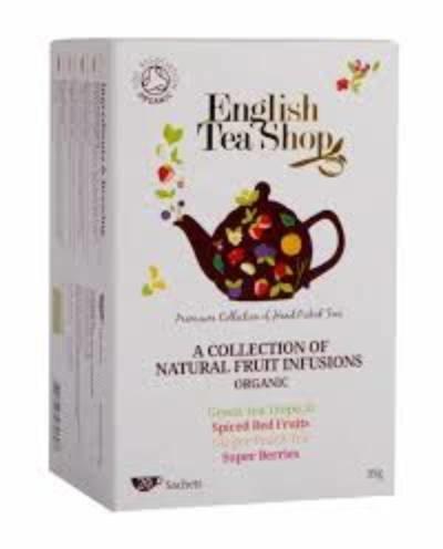 English Tea Shop 20 bio gyümölcsös teaválogatás 40 g ETS 20 Gyümölcsös válogatás bio tea -4 féle gyümölcsös íz. ETS 20 Szuperbogyó bio tea - 5 db teafilter. Koffeinmentes! Összetevők: hibiszkusz (63%)*, rooibos (19%)*, cékla(6,5%)*, fodormenta (4%)*, természetes eper (3%) és málna (2, %) ízesítéssel, feketeszeder levelek* (1%), málna* (0,5%), eper* (0,5%), kékáfonya*(0,