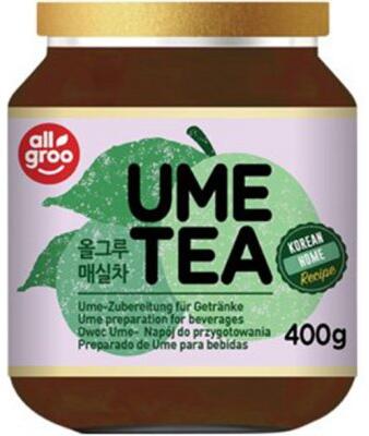 Allgroo Ume szilva tea 400g Allgroo készítmény koreai Ume teához. Elkészítés: A termék hideg és meleg italok készítésére alkalmas. Adjunk hozzá 2 evőkanál terméket 100 ml hideg vagy forró vízhez, és jól keverjük össze. Hozzávalók: Származási ország: Dél-Korea Tárolási mód: Száraz és sötét helyen tárolandó. Felbontás után hűtőszekrényben kell tárolni és
