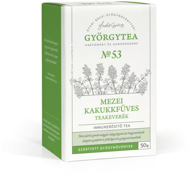 A Györgytea Mezei kakukkfüves teakeverék (No. 53) természetes immunerősítő hatóanyagai révén támogatja a szervezet védekezőképességét megfázás és influenza esetén. A gondosan összeválogatott gyógynövények fertőtlenítő és gyulladáscsökkentő hatásukkal segítenek gyorsabban átvészelni a betegségeket, így ideális választás az őszi-téli időszakban. Elkészít