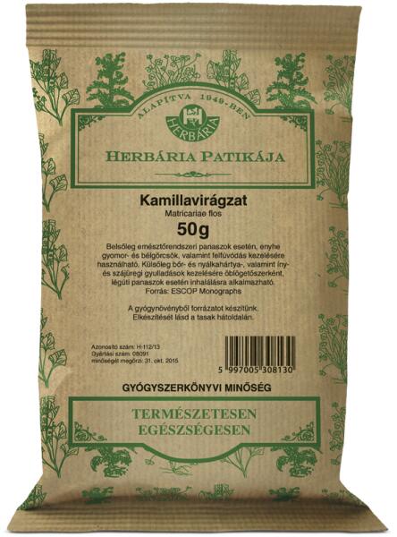 Herbária kamillavirágzat tea 50g Hivatalos magyarországi forgalmazótól. Leírás: A tápcsatorna gyulladásos megbetegedéseiben, emésztőrendszeri görcsök és puffadás esetén önállóan vagy gyógyszeres terápia kiegészítéseként alkalmazható. Felső légúti megbetegedésekben inhalálva antibakteriális hatása révén gyorsítja a gyógyulás folyamatát. Külsőleg alkalmazva