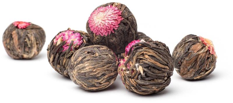 Ritkaság - Fekete tea kézzel kötve, úgy, hogy 1 golyó egy nagy bögre teára elég legyen, a leöntés után a tea csodás gyöngyökbe, rózsaszínes -pirosas virágokba rügyezik. Ennek a virágzó teának egyedülálló az íz kombinációja: a fekete tea és az édeskés virágok. 100 g csomagolásban kb. 15 virágzó golyó található.