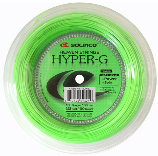 Solinco Hyper-G teniszhúr (100m) - zöld Solinco Hyper G ez egy csúcsminőségű és hihetetlen specifikációjú húr egyedi, feltűnő zöld színben. Úgy tervezték, hogy elősegítse a magas teljesítményt, garantálja a kivételes érintést és a kiváló irányítást. A Solinco Hyper-G egy szögletes húr, amelyet úgy terveztek, hogy kiváló spin potenciált és precíz ütéseket bi