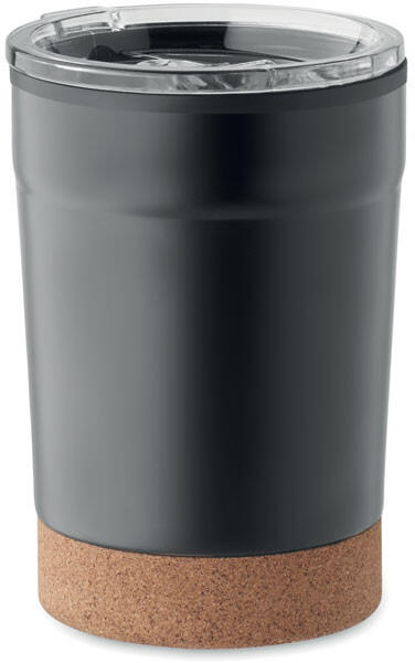 Duplafalú rozsdamentes acél pohár PP belső oldallal, parafa talppal és csúsztatható ivónyílással ellátott fedéllel. Szivárgásmentes. Űrtartalom: 300 ml.