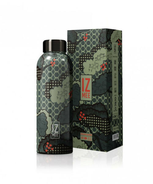 500 ml-es szigetelt kulacs zöld alappal, stilizált virágos illusztrációval, titán színű kupakkal és ikonikus sárga, szilikon csúszásmentes aljjal. IZMEE. A zen tanítások temploma, a Kelet stílusa minden kortyban. A HOKKAIDO GARDEN acél kulacs, a harmonikus japán stílust idézi. Olaszországban készült dizájn, fényes felülettel és ikonikus sárga szilikon alsórésszel, test