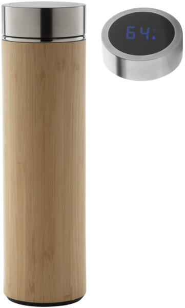 Duplafalú rozsdamentes acél és bambusz termosz, LED érintőképernyős hőmérővel a fedelén, teafűtartóval. 500 ml. Gombelemmel szállítjuk.