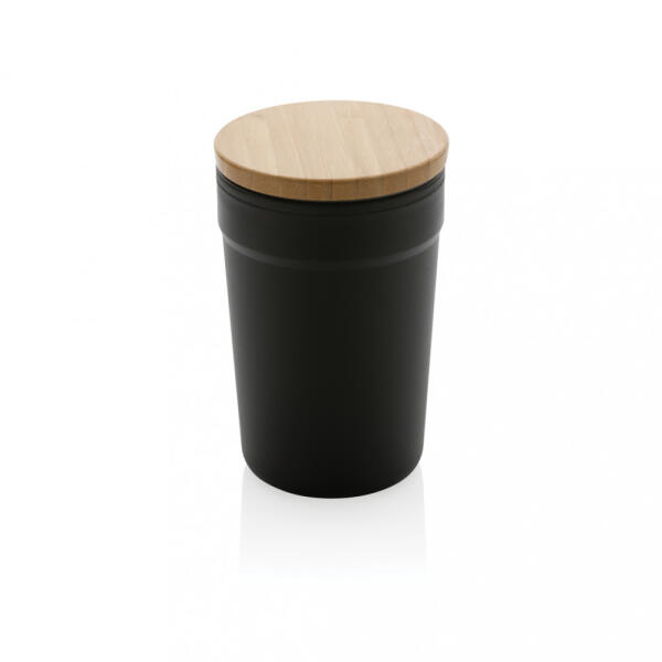 Ez a stílusos, bambusz fedéllel ellátott pohár GRS újrahasznosított PP-ből készül. A GRS-tanúsítvány biztosítja az újrahasznosított anyagok ellátási láncát. Bambusz fedéllel ellátva útközbeni használatra. Teljes újrahasznosított anyag tartalom: 52% a termék összsúlya alapján. A pohár teste mikrohullámú sütőben használható és mosogatógépben mosható. BPA-ment