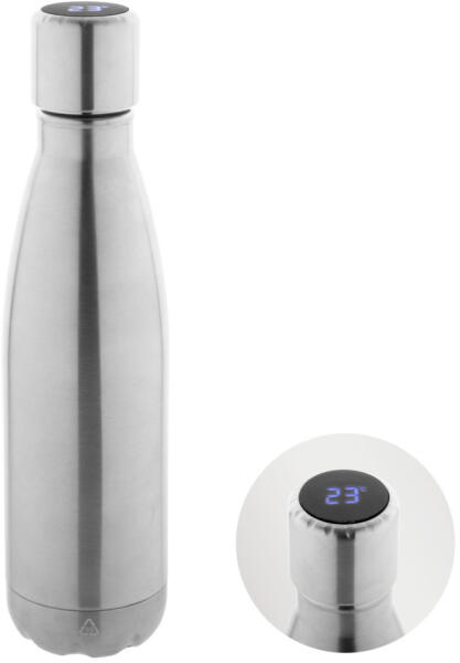 Duplafalú rozsdamentes acél fedelén érintőképernyős LED-es hőmérővel. 500 ml. Beépített, újratölthető akkumulátorral. USB töltőkábellel szállítjuk.