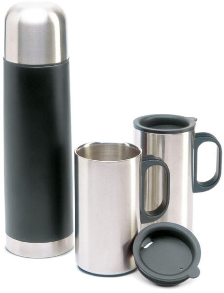 Duplafalú rozsdamentes acél termosz (500 ml) 2 bögrével (200 ml) vastag karton ajándékdobozban.
