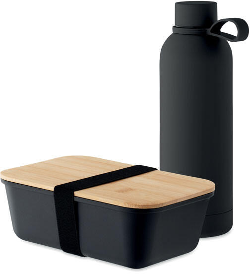 2 részes ajándékszett, amely tartalmaz egy duplafalú termoszpalackot újrahasznosított rozsdamentes acélból (90% újrahasznosított- és 10% rozsdamentes acél) és egy újrahasznosított PP uzsonnásdobozt bambuszfedéllel és RPET rögzítőpánttal. Űrtartalom 500 ml és 900 ml.