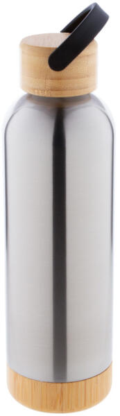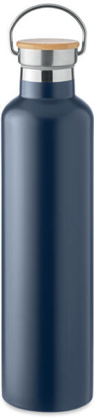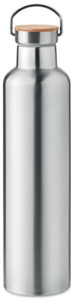 Duplafalú rozsdamentes acél termosz fém fogantyús bambusz kupakkal. Űrtartalom: 1 l. A bambusz természetes anyag, színében, mintázatában és méretében esetenként eltérő lehet.