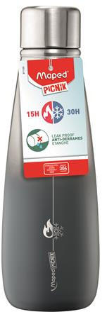 Termosz, duplafalú, 500 ml, rozsdamentes acél, MAPED PICNIK "Concept Adult", szürke Elegáns megjelenésű rozsdamentes acél palack, mely 15 órán át melegen és 30 órán át hidegen tartja kedvenc italát. - tökéletesen záródó, mégis könnyen kezelhető, csavaros kupak - szivárgásmentes - rozsdamentesacél test - vákuumszigetelés, ami megakadályozza a külső páralecsapódást