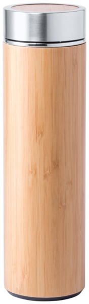 Rozsdamentes acélból és bambuszból készült termosz, 500 ml, csavaros tetővel. Kb. 7 cm átmérőjű, kb. 24 cm magas.