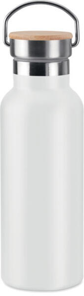 Duplafalú rozsdamentes acél termosz 500 ml űrtartalommal. Fém fogantyús bambusz kupakkal. A szublimációs nyomtatás csak a fehér színű terméken érhető el. Szivárgásmentes. A bambusz természetes anyag, színében, mintázatában és méretében esetenként eltérő lehet.