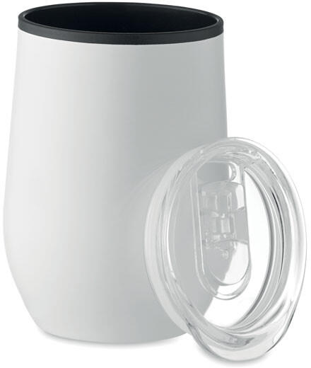 Duplafalú rozsdamentes acél pohár PP belső résszel és átlátszó PS fedéllel. Űrtartalom: 350 ml.